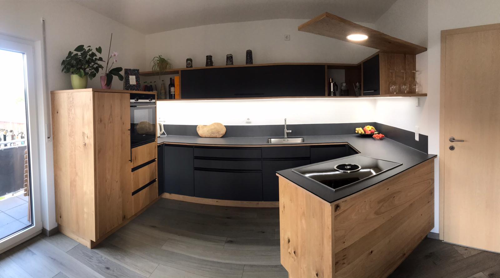 Schreinerküche mit Koch- und Spülinsel